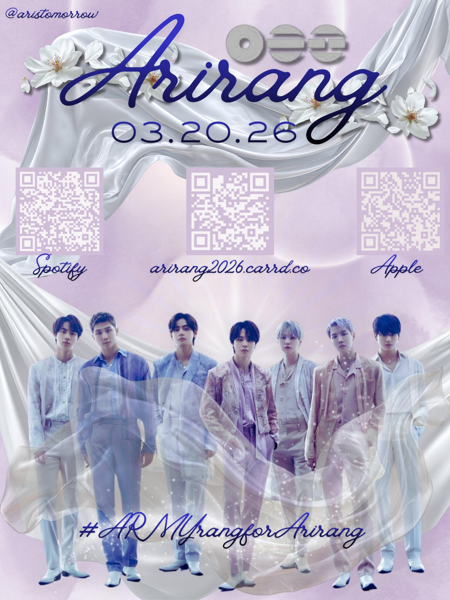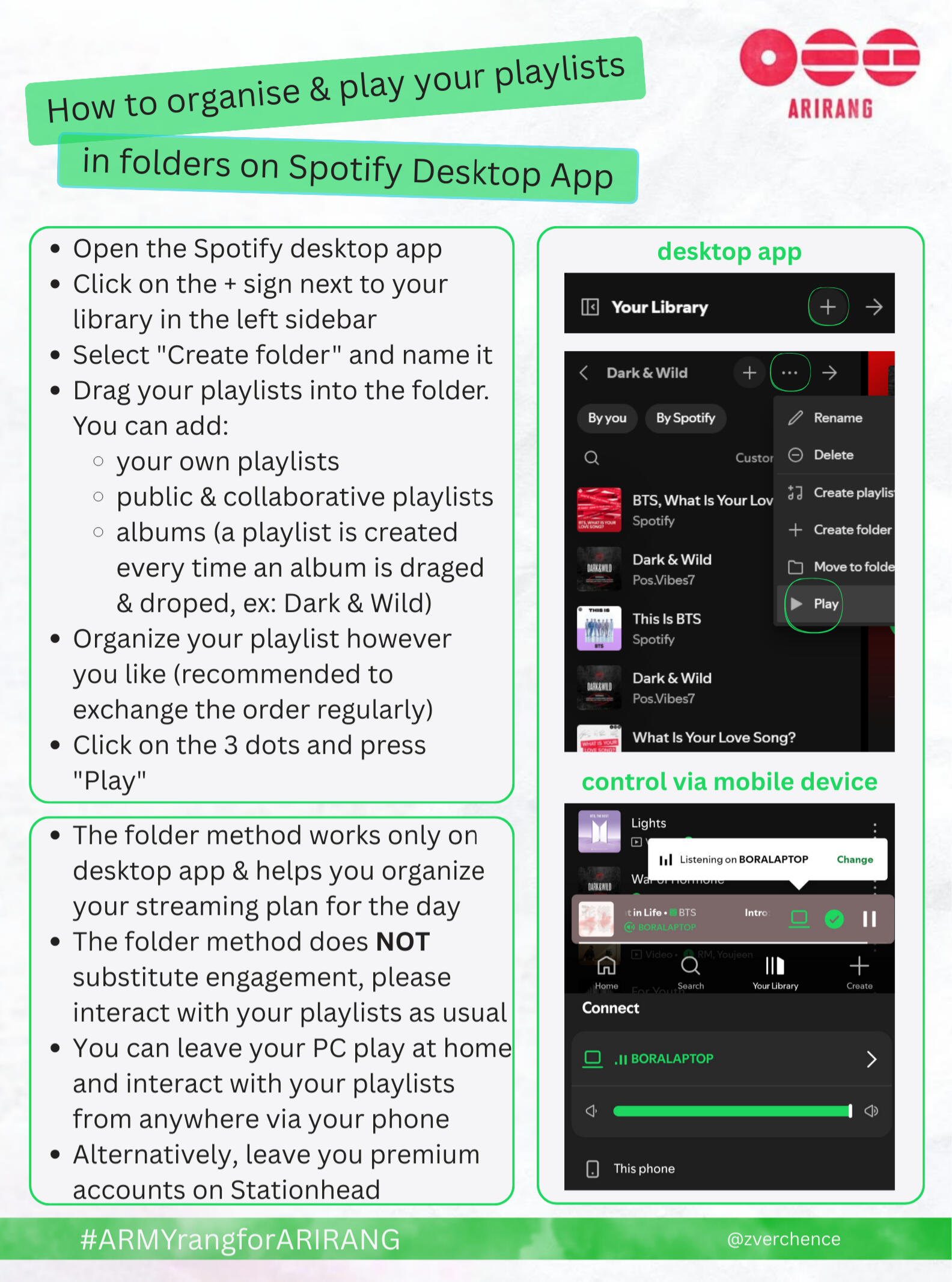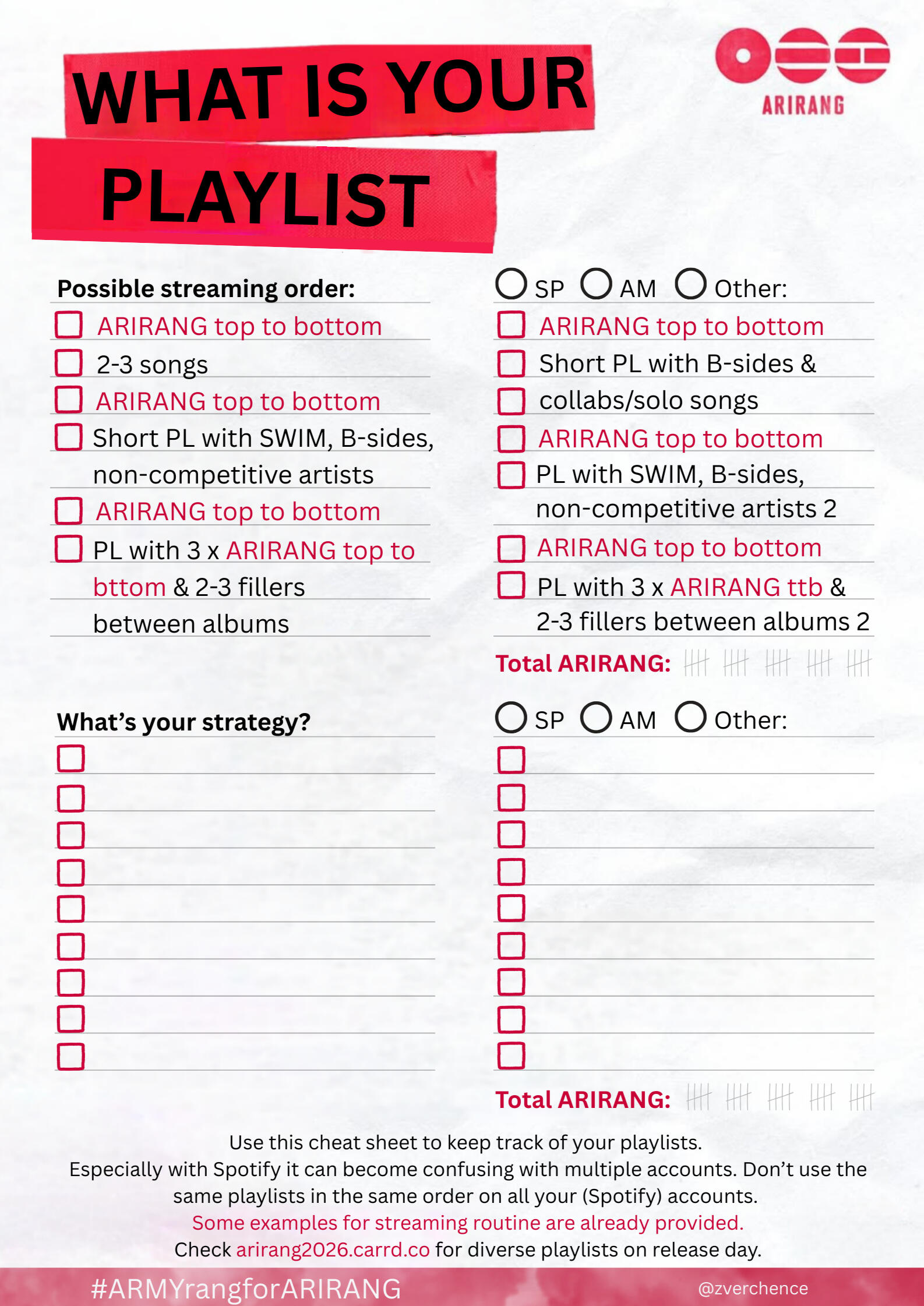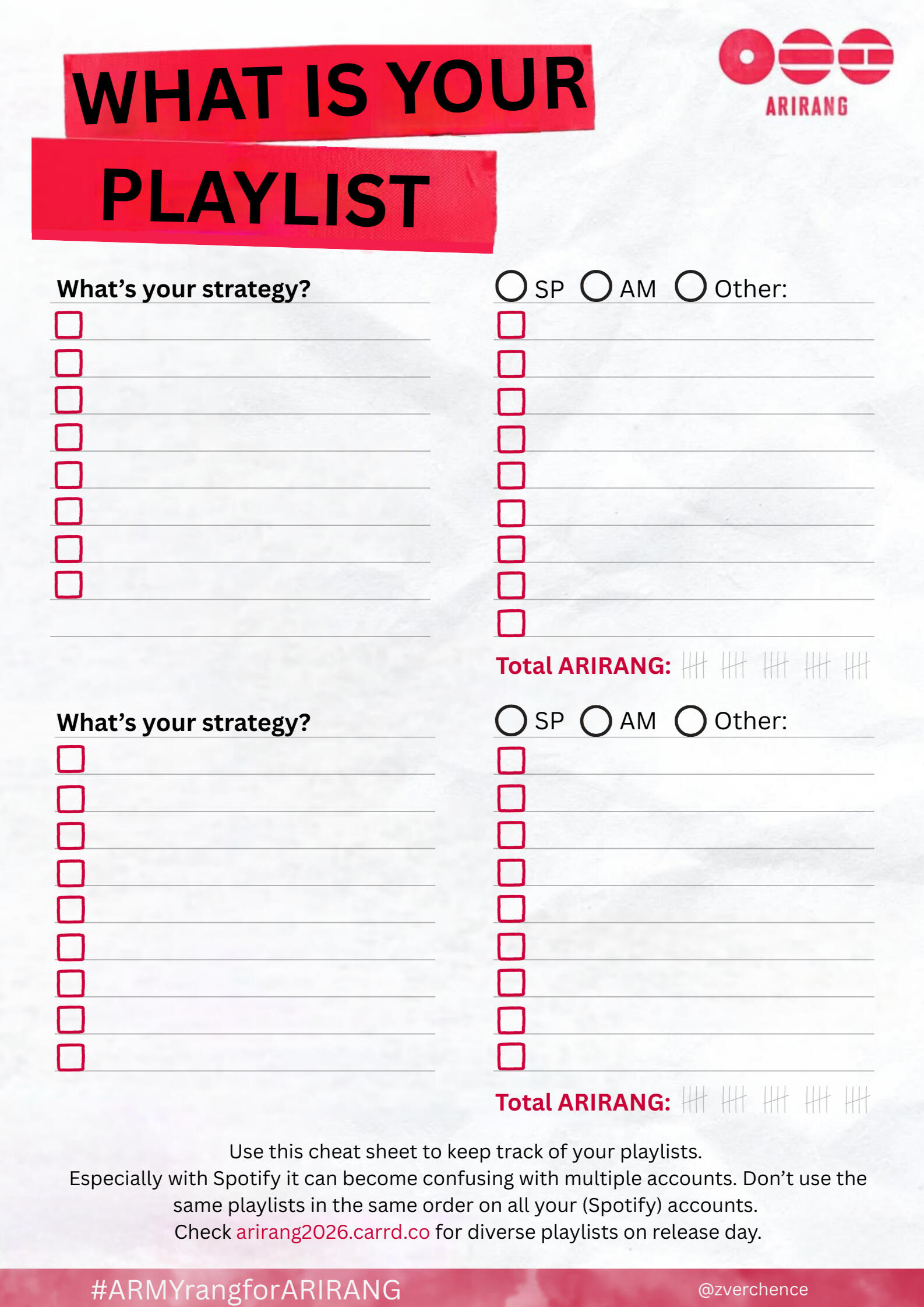 ARMY, Rule no. 1 is playing ARIRANG from top to bottom as many times as you wish in a day, without looping. Use the following guide to check your playlists and keep them on track.