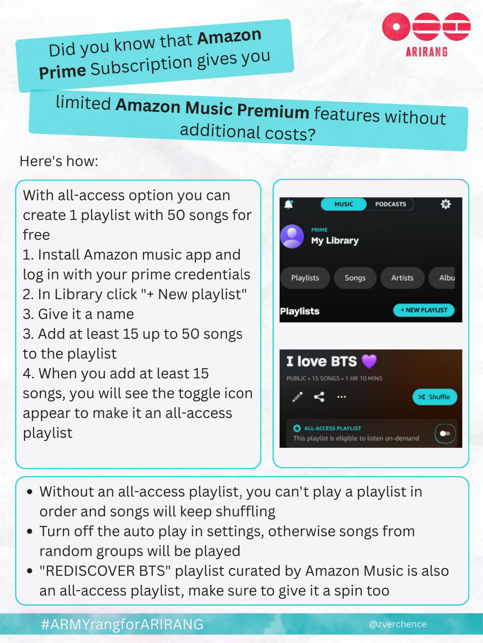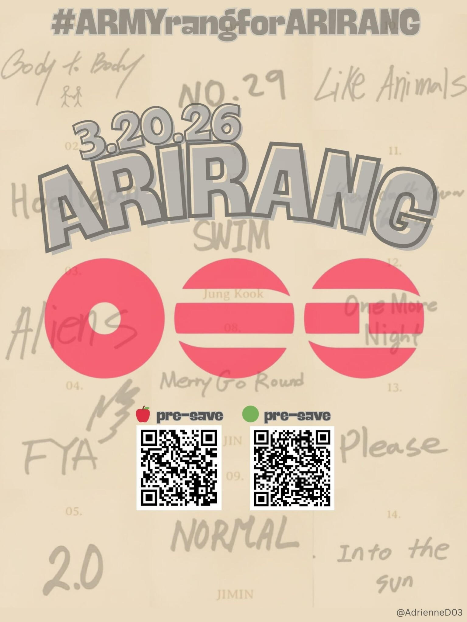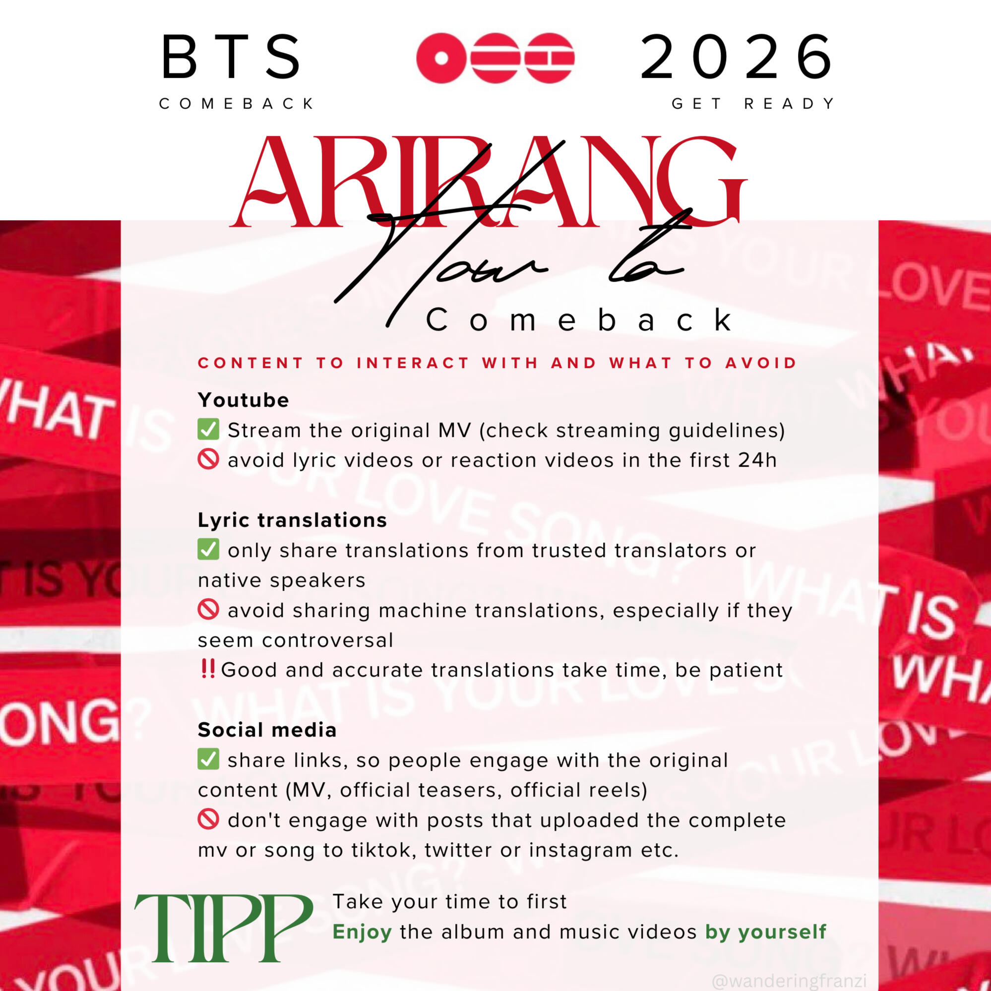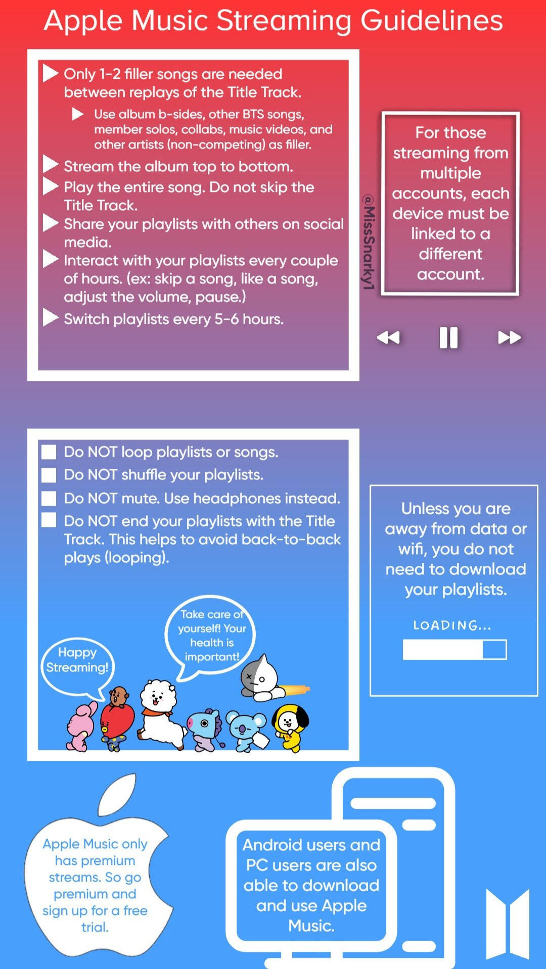 ARMY, Rule no. 1 is playing ARIRANG from top to bottom as many times as you wish in a day, without looping. Use the following guide to check your playlists and keep them on track.